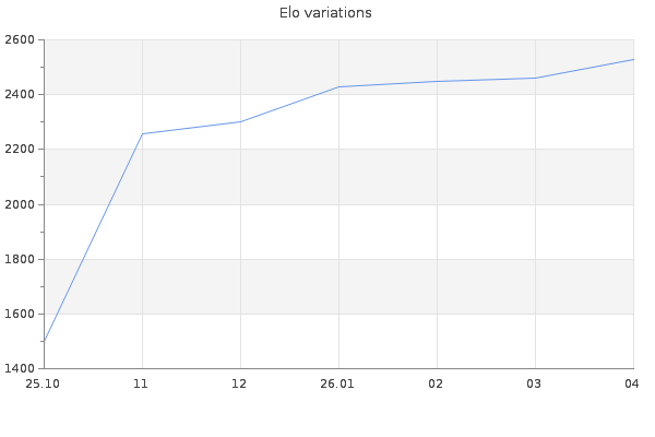 Elo no rounded:2526.7 Rd ( Small rd indicates a reliable elo ) : 80 Elo max :2530 Elo max this year :2530 Moves played :1406 Country:Germany