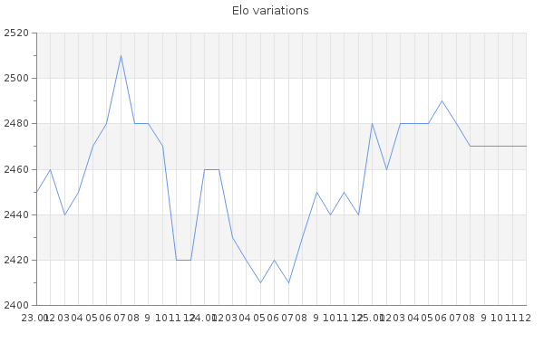 Elo no rounded:2467.5 Rd ( Small rd indicates a reliable elo ) : 83 Elo max :2510 Elo max this year :2510 Moves played :5841 Country:Belgium
