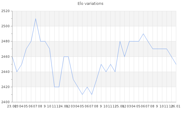 Elo no rounded:2448 Rd ( Small rd indicates a reliable elo ) : 88 Elo max :2510 Elo max this year :2510 Moves played :5931 Country:Belgium