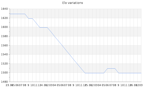Elo no rounded:1499 Rd ( Small rd indicates a reliable elo ) : 350 Elo max :0 Elo max this year :0 Moves played :0 Country:Sierra Leone