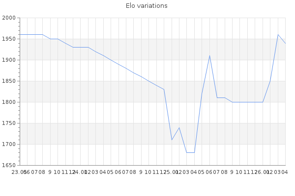 Elo no rounded:1937.9 Rd ( Small rd indicates a reliable elo ) : 85 Fast Elo :2030 Fast Rd : 145 Elo max :2480 Elo max this year :2480 Moves played :10473 Country:Israel