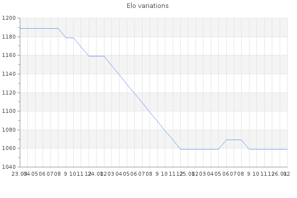 Elo no rounded:1061.3 Rd ( Small rd indicates a reliable elo ) : 203 Elo max :0 Elo max this year :0 Moves played :42 Country:United States of America