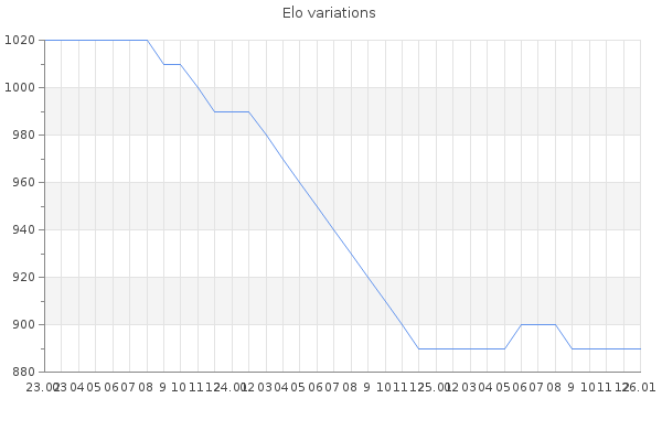 Elo no rounded:892.2 Rd ( Small rd indicates a reliable elo ) : 84 Elo max :1740 Elo max this year :1740 Moves played :1032 Country:Argentina
