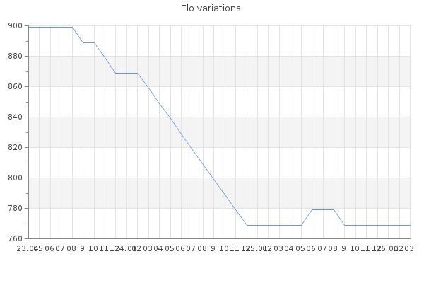 Elo no rounded:766.5 Rd ( Small rd indicates a reliable elo ) : 150 Fast Elo :1419 Fast Rd : 278 Elo max :0 Elo max this year :0 Moves played :0 Country:Croatia
