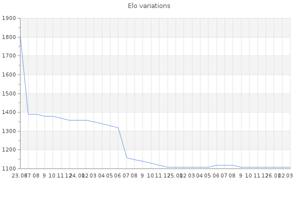 Elo no rounded:1106.4 Rd ( Small rd indicates a reliable elo ) : 165 Elo max :0 Elo max this year :0 Moves played :180 Country:Poland