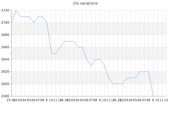 Elo no rounded:2584.3 Rd ( Small rd indicates a reliable elo ) : 108 Fast Elo :2139 Fast Rd : 163 Elo max :3030 Elo max this year :3030 Moves played :15829 Country:Spain