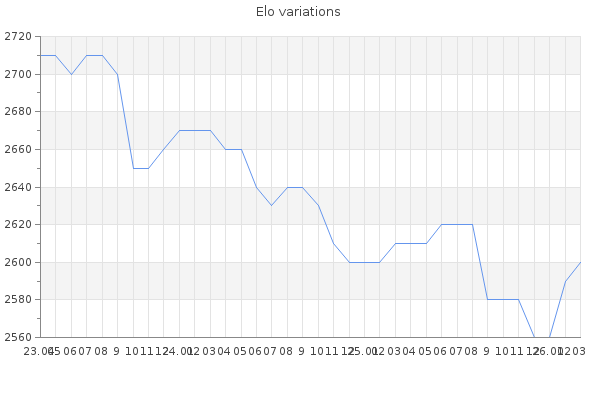 Elo no rounded:2597.7 Rd ( Small rd indicates a reliable elo ) : 99 Fast Elo :2139 Fast Rd : 163 Elo max :3030 Elo max this year :3030 Moves played :16021 Country:Spain