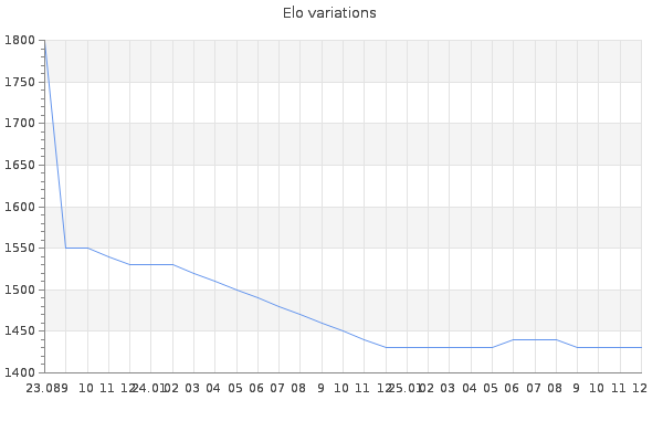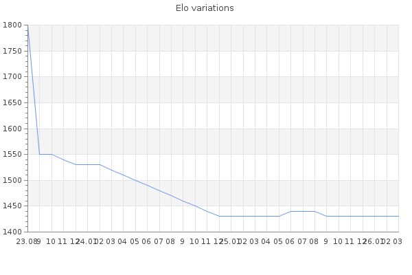 Elo no rounded:1427.6 Rd ( Small rd indicates a reliable elo ) : 144 Elo max :1570 Elo max this year :1570 Moves played :185 Country:Russia