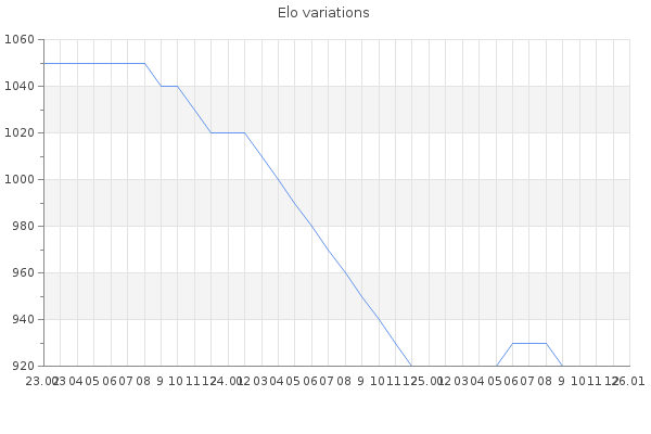 Elo no rounded:915.6 Rd ( Small rd indicates a reliable elo ) : 80 Elo max :1600 Elo max this year :1600 Moves played :460 Country:United States of America
