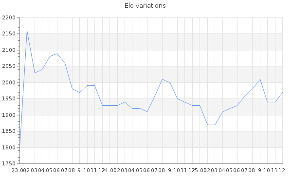 Elo no rounded:1966.7 Rd ( Small rd indicates a reliable elo ) : 92 Elo max :2180 Elo max this year :2180 Moves played :7088 Country:Trinidad and Tobago