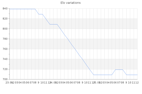 Elo no rounded:704.4 Rd ( Small rd indicates a reliable elo ) : 224 Elo max :0 Elo max this year :0 Moves played :0 Country:Argentina