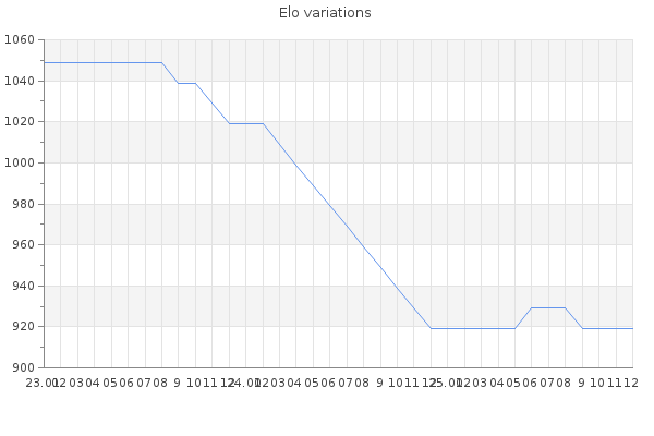 Elo no rounded:916.6 Rd ( Small rd indicates a reliable elo ) : 307 Elo max :0 Elo max this year :0 Moves played :137 Country:other Country
