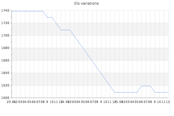 Elo no rounded:1607.6 Rd ( Small rd indicates a reliable elo ) : 150 Elo max :0 Elo max this year :0 Moves played :288 Country:United Kingdom