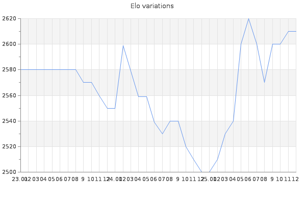 Elo no rounded:2608.3 Rd ( Small rd indicates a reliable elo ) : 103 Elo max :2870 Elo max this year :2870 Moves played :12546 Country:Algeria