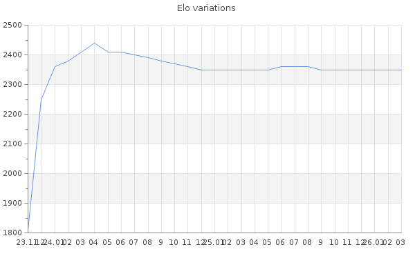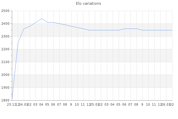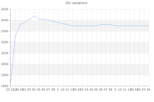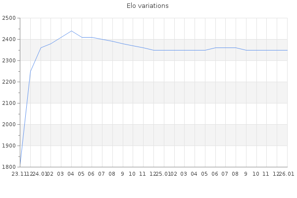 Elo no rounded:2348.2 Rd ( Small rd indicates a reliable elo ) : 87 Elo max :2440 Elo max this year :2440 Moves played :1309 Country:Estonia