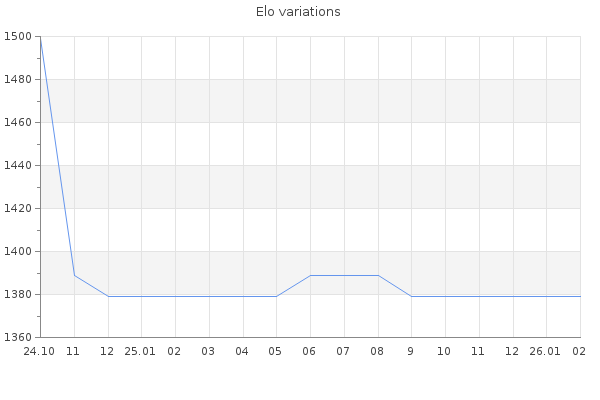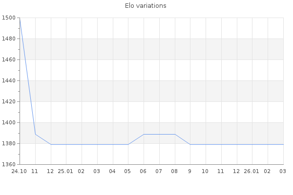 Elo no rounded:1375.3 Rd ( Small rd indicates a reliable elo ) : 227 Elo max :0 Elo max this year :0 Moves played :4 Country:United States of America