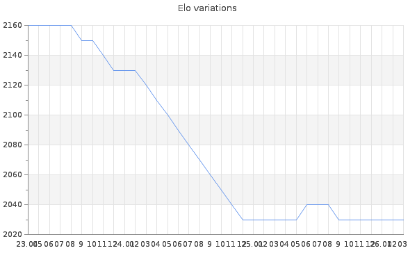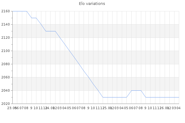 Elo no rounded:2033.6 Rd ( Small rd indicates a reliable elo ) : 94 Elo max :2390 Elo max this year :2390 Moves played :986 Country:Italy