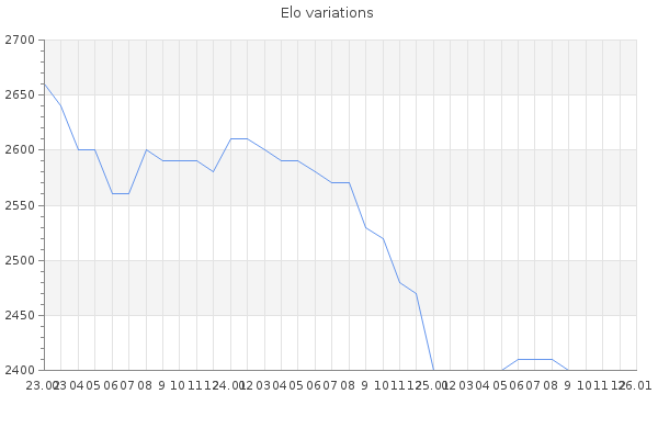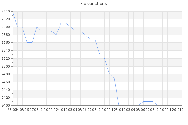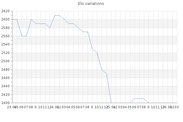 Elo no rounded:2404.3 Rd ( Small rd indicates a reliable elo ) : 95 Elo max :2880 Elo max this year :2880 Moves played :12509 Country:Germany
