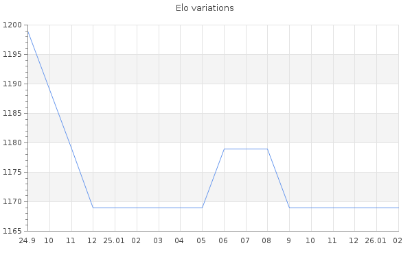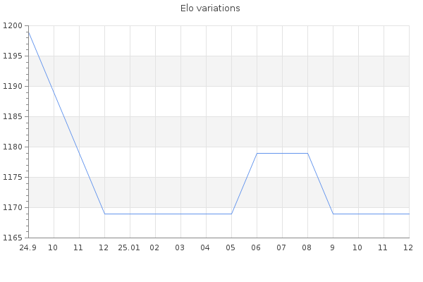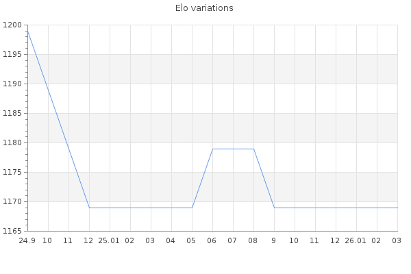 Elo no rounded:1169 Rd ( Small rd indicates a reliable elo ) : 350 Elo max :0 Elo max this year :0 Moves played :0 Country:United States of America