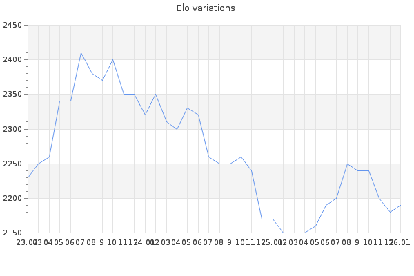 Elo no rounded:2186.1 Rd ( Small rd indicates a reliable elo ) : 105 Elo max :2680 Elo max this year :2680 Moves played :19873 Country:Argentina