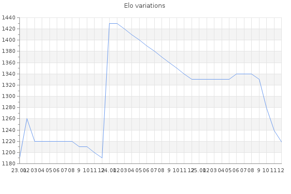 Elo no rounded:1214.4 Rd ( Small rd indicates a reliable elo ) : 154 Elo max :1450 Elo max this year :1450 Moves played :533 Country:United Kingdom
