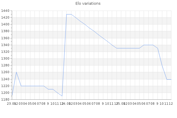 Elo no rounded:1234.8 Rd ( Small rd indicates a reliable elo ) : 159 Elo max :1450 Elo max this year :1450 Moves played :533 Country:United Kingdom