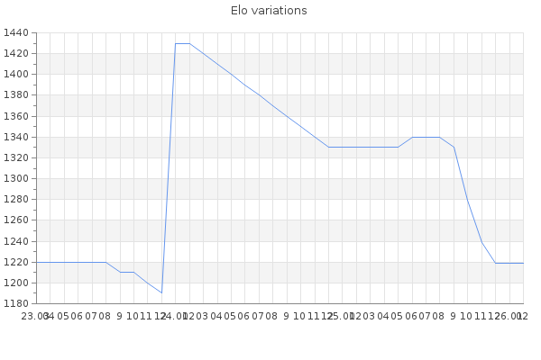 Elo no rounded:1214.4 Rd ( Small rd indicates a reliable elo ) : 154 Elo max :1450 Elo max this year :1450 Moves played :534 Country:United Kingdom
