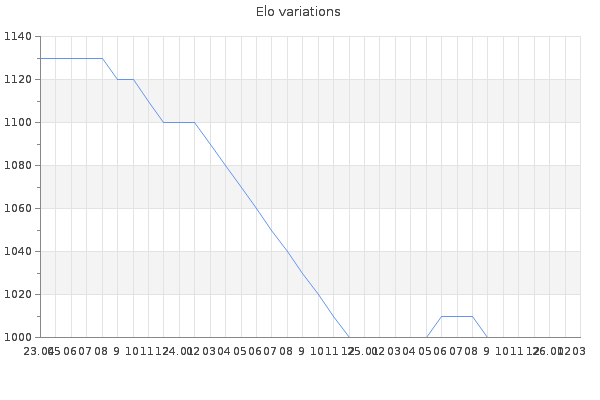 Elo no rounded:1000.8 Rd ( Small rd indicates a reliable elo ) : 135 Fast Elo :1509 Fast Rd : 272 Elo max :1410 Elo max this year :1410 Moves played :0 Country:United States of America