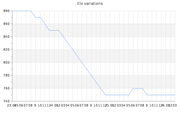 Elo no rounded:748.6 Rd ( Small rd indicates a reliable elo ) : 88 Elo max :1200 Elo max this year :1200 Moves played :0 Country:Canada