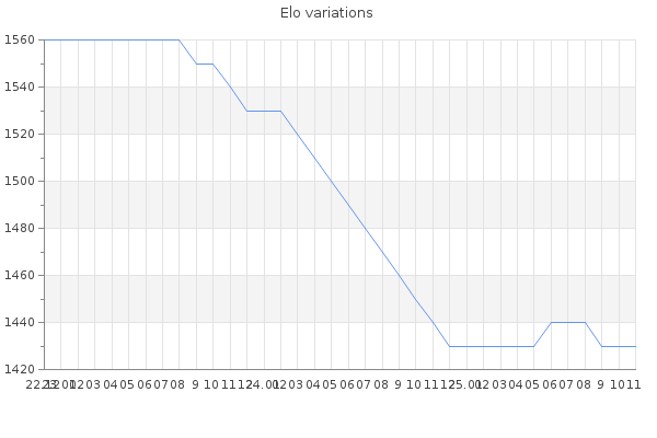 Elo no rounded:1427.6 Rd ( Small rd indicates a reliable elo ) : 120 Elo max :1690 Elo max this year :1690 Moves played :452 Country:Chile