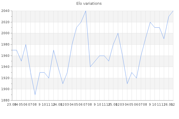 Elo no rounded:2037.8 Rd ( Small rd indicates a reliable elo ) : 88 Fast Elo :1429 Fast Rd : 294 Elo max :2270 Elo max this year :2270 Moves played :44023 Country:Turkey