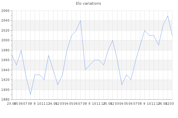 Tournaments win : 2026.03.05 : First in the tournament n°11051(Level 4 ) 2025.11.03 : First in the tournament n°11042(Level 4 ) 2025.09.08 : First in the tournament n°11029(Level 4 ) 2024.10.29 : First in the tournament n°11000(Level 4 ) 2024.06.13 : First in the tournament n°10952(Level 4 ) 2022.08.12 : First in the tournament n°10723(Level 4 ) 2021.09.27 : First in the tournament n°10573(Level 4 ) 2020.11.17 : First in the tournament n°10445(Level 4 ) 2020.03.07 : First in the tournament n°10204(Level 5 ) 2017.12.08 : First in the tournament n°9610(Level 5 ) 2017.11.06 : First in the tournament n°9499(Level 5 ) 2017.10.24 : First in the tournament n°9501(Level 5 ) 2017.05.10 : First in the tournament n°9275(Level 5 ) 2017.01.30 : First in the tournament n°9065(Level 5 ) 2016.04.16 : First in the tournament n°8584(Level 5 ) 2015.09.16 : First in the tournament n°8229(Level 4 ) 2015.07.20 : First in the tournament n°8076(Level 4 ) 2013.09.15 : First in the tournament n°6611(Level 4 ) 2013.03.18 : First in the tournament n°6298(Level 4 ) 2013.02.17 : First in the tournament n°6195(Level 4 )