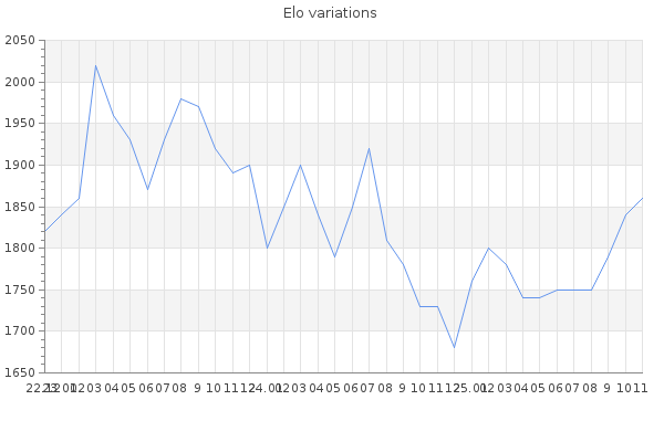 Elo no rounded:1858.3 Rd ( Small rd indicates a reliable elo ) : 89 Elo max :2110 Elo max this year :2110 Moves played :92079 Country:Argentina