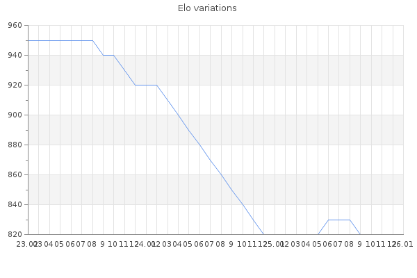 Elo no rounded:820.2 Rd ( Small rd indicates a reliable elo ) : 118 Fast Elo :1429 Fast Rd : 256 Elo max :1230 Elo max this year :1230 Moves played :60 Country:Turkey