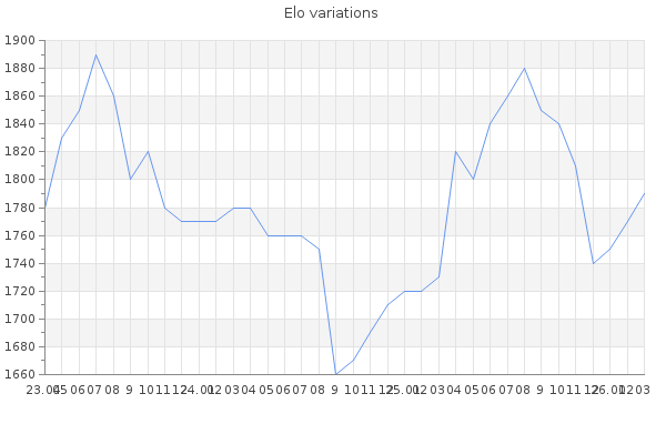 Elo no rounded:1789.5 Rd ( Small rd indicates a reliable elo ) : 99 Fast Elo :1379 Fast Rd : 251 Elo max :2080 Elo max this year :2080 Moves played :23968 Country:Spain