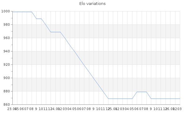 Elo no rounded:872 Rd ( Small rd indicates a reliable elo ) : 197 Elo max :0 Elo max this year :0 Moves played :53 Country:Italy