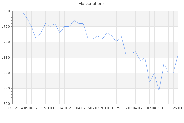Elo no rounded:1663.2 Rd ( Small rd indicates a reliable elo ) : 91 Fast Elo :1789 Fast Rd : 251 Elo max :2170 Elo max this year :2170 Moves played :44922 Country:Italy