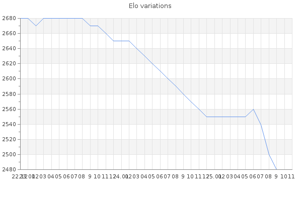 Elo no rounded:2482.1 Rd ( Small rd indicates a reliable elo ) : 117 Elo max :2750 Elo max this year :2750 Moves played :12232 Country:United States of America