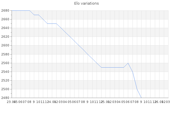 Elo no rounded:2482.1 Rd ( Small rd indicates a reliable elo ) : 117 Elo max :2750 Elo max this year :2750 Moves played :12275 Country:United States of America