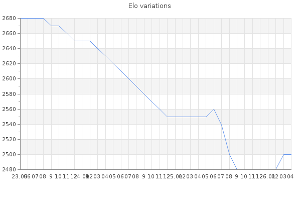 Elo no rounded:2498.5 Rd ( Small rd indicates a reliable elo ) : 135 Elo max :2750 Elo max this year :2750 Moves played :12275 Country:United States of America