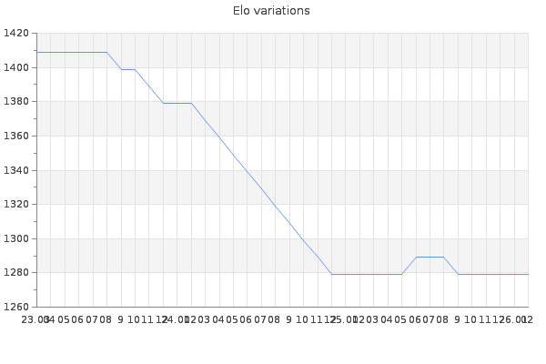 Elo no rounded:1280.2 Rd ( Small rd indicates a reliable elo ) : 198 Elo max :0 Elo max this year :0 Moves played :17 Country:Spain