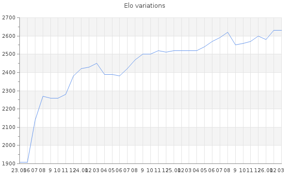 Remaining days of holidays :5 Elo no rounded:2632.8 Rd ( Small rd indicates a reliable elo ) : 85 Elo max :2630 Elo max this year :2630 Moves played :2702 Country:Czech Republic