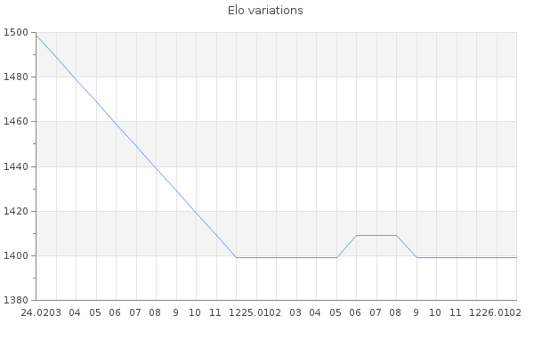 Elo no rounded:1399 Rd ( Small rd indicates a reliable elo ) : 350 Elo max :0 Elo max this year :0 Moves played :1 Country:United Kingdom