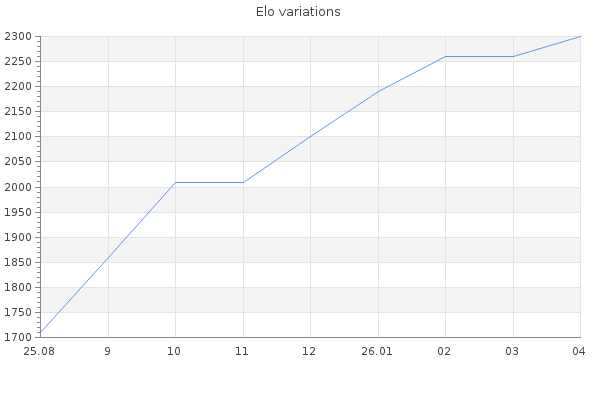Elo no rounded:2296.7 Rd ( Small rd indicates a reliable elo ) : 121 Elo max :2300 Elo max this year :2300 Moves played :379 Country:Germany