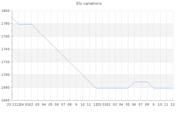 Elo no rounded:1679 Rd ( Small rd indicates a reliable elo ) : 350 Elo max :0 Elo max this year :0 Moves played :0 Country:Greece