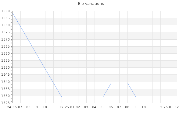 Elo no rounded:1629 Rd ( Small rd indicates a reliable elo ) : 350 Elo max :0 Elo max this year :0 Moves played :0 Country:Canada