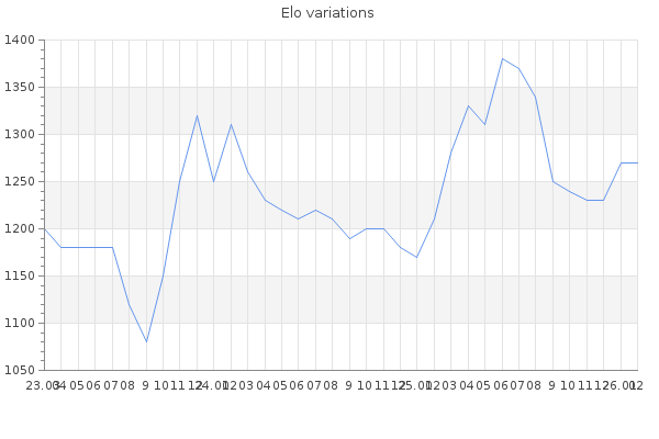 Elo no rounded:1265.3 Rd ( Small rd indicates a reliable elo ) : 92 Elo max :1570 Elo max this year :1570 Moves played :1679 Country:United States of America