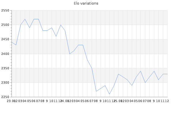 Elo no rounded:2330.3 Rd ( Small rd indicates a reliable elo ) : 80 Elo max :2720 Elo max this year :2720 Moves played :41139 Country:Malta
