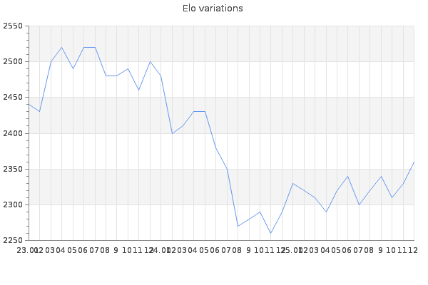 Elo no rounded:2357.1 Rd ( Small rd indicates a reliable elo ) : 84 Elo max :2720 Elo max this year :2720 Moves played :41204 Country:Malta