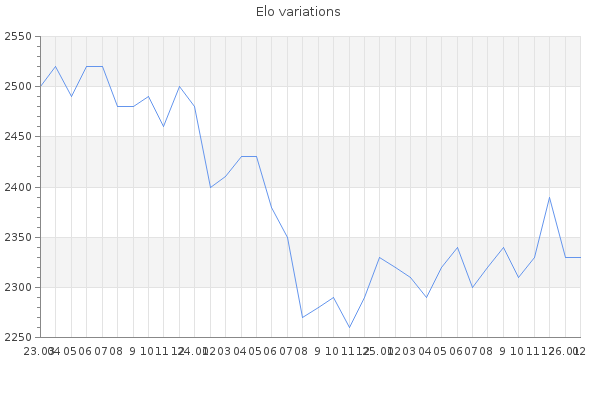 Elo no rounded:2334.8 Rd ( Small rd indicates a reliable elo ) : 80 Elo max :2720 Elo max this year :2720 Moves played :41487 Country:Malta